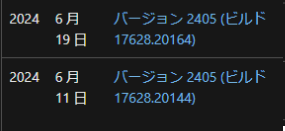 例えば、最新チャネルの 6/19 では、バージョンは 2405 のまま、ビルドのみ上がっておりますので、これはセキュリティ更新、セキュリティ以外の更新(修正)となります。