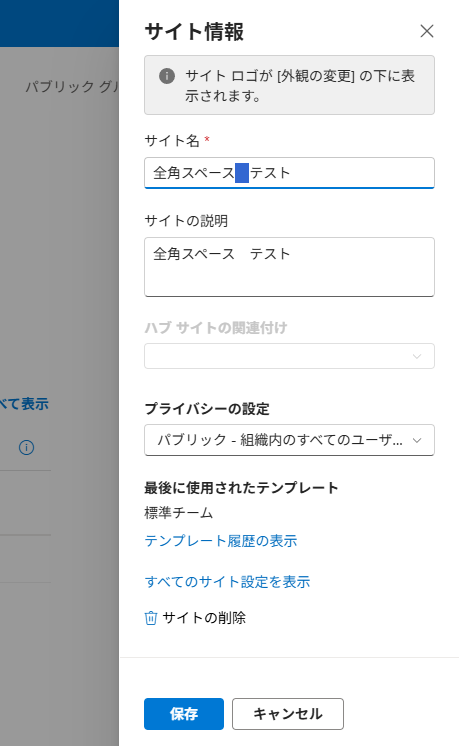 存在する場合、対象の SharePoint サイトにおいて、設定 - サイト情報 - サイト名から全角スペースを取り除いて下さい。