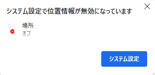 をオンにすることで「システム設定で位置情報が無効になっています」は表示されなくなります。